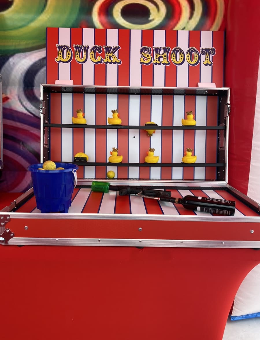 Setting up the Duck Shoot stall is a breeze, as it comes in a self-contained package with everything you need. Simply unpack, set up the boards, and you're ready to go! Please note that guns, tables, and tablecloths are available separately if needed.