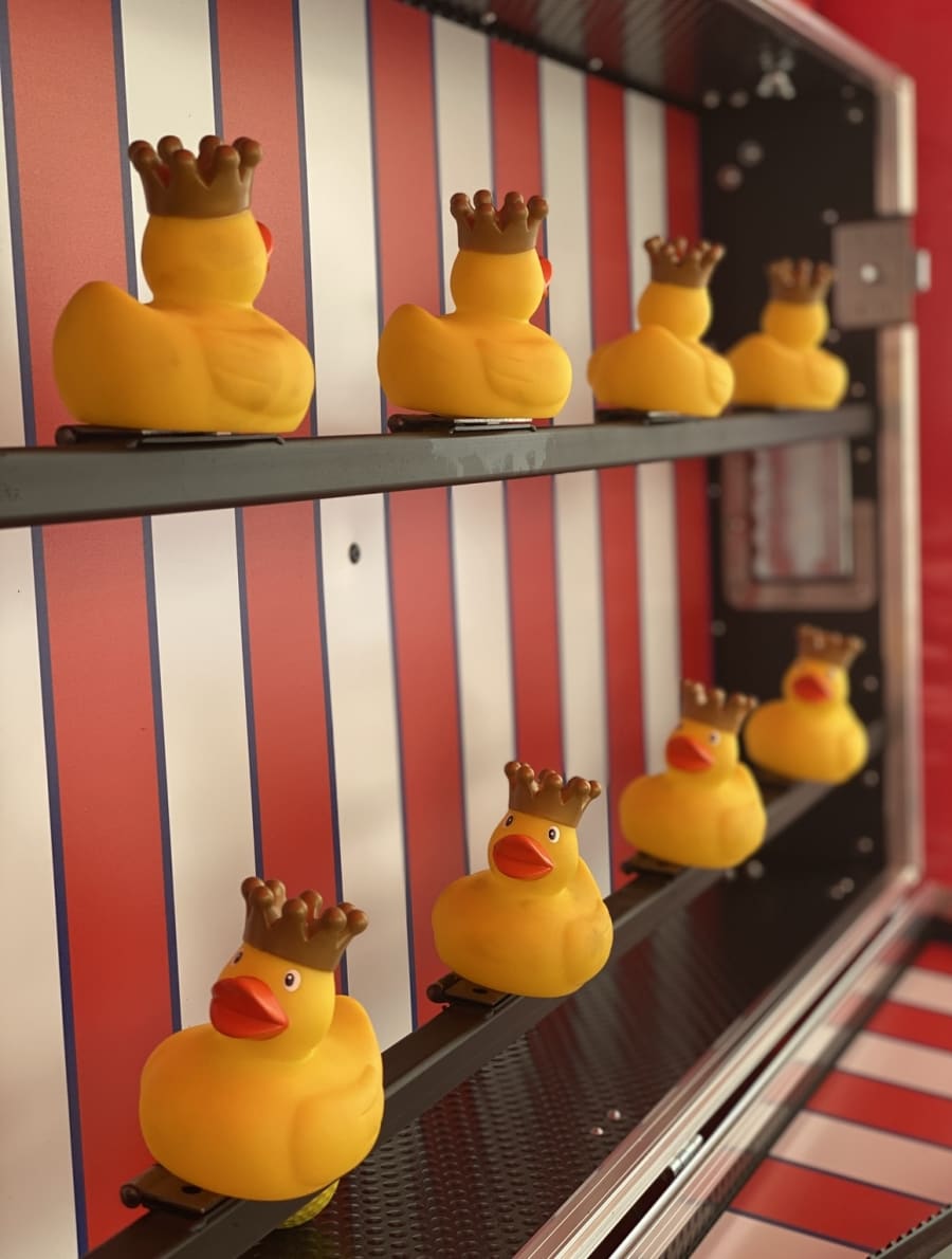 The Duck Shoot stall features two rows of four rubber ducks, lined up and ready to be knocked over. Your mission is to take aim and shoot them down using your weapon of choice. Whether you prefer cork guns, Nerf guns, bean bags, or any other suitable projectile, the challenge is on to knock down as many ducks as possible!