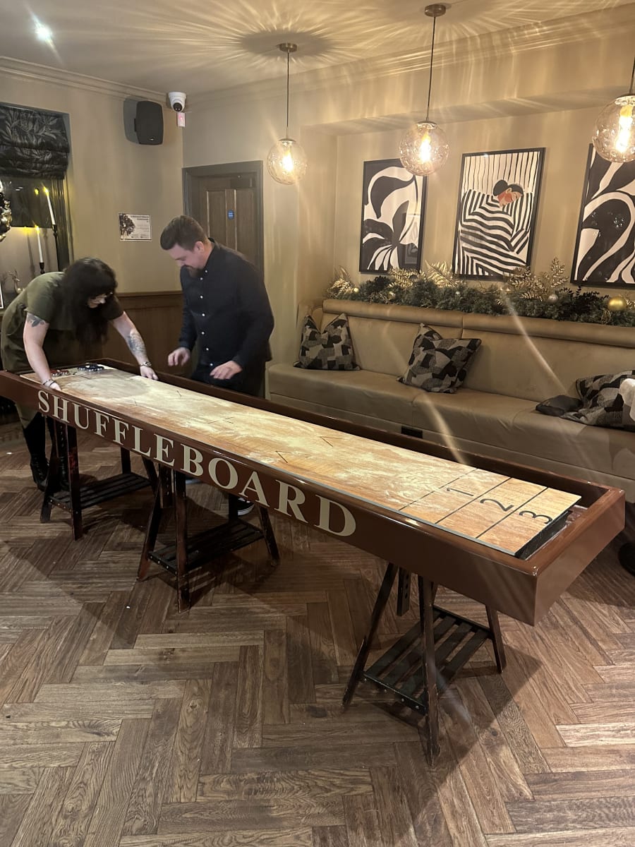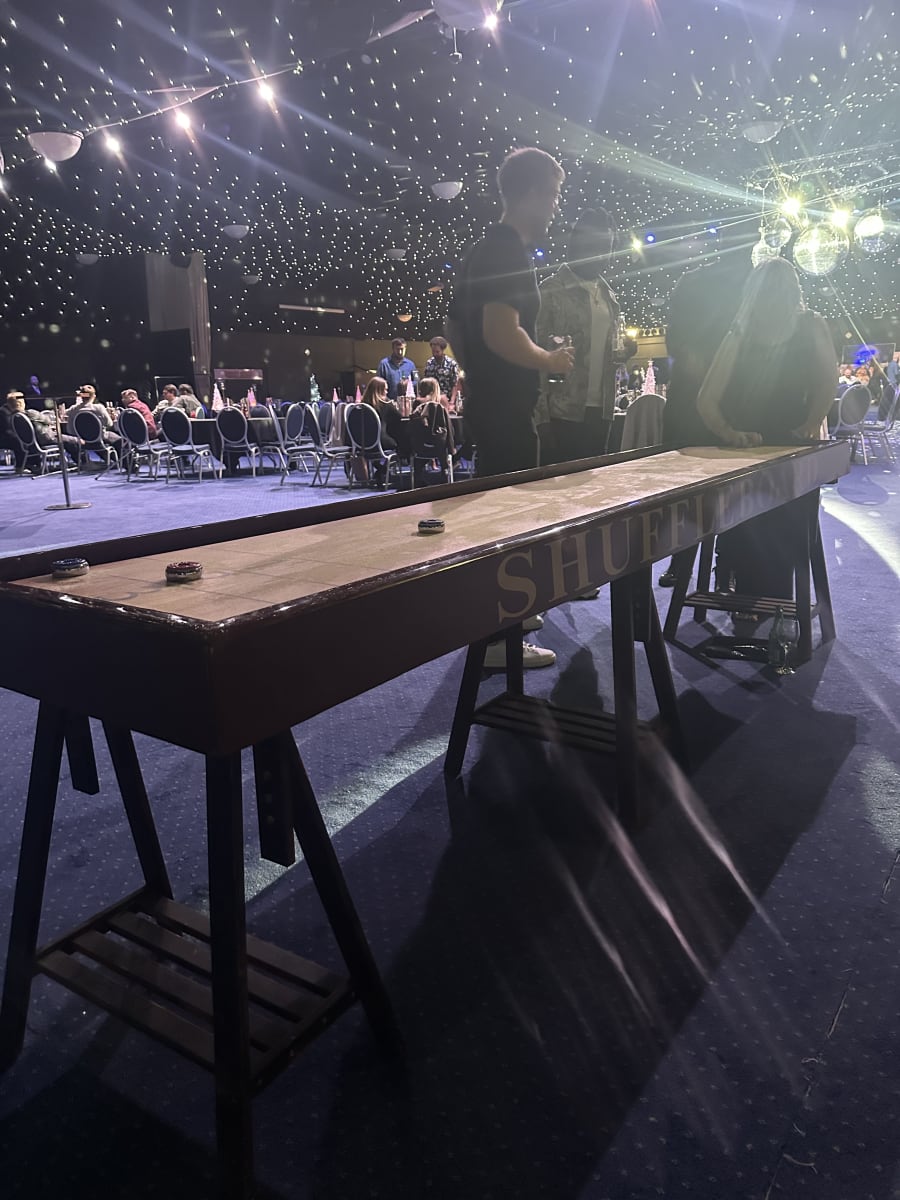 Introducing our pub-style Shuffleboard, the perfect addition to any event or gathering. With its impressive 10ft length, this mobile Shuffleboard provides endless entertainment for all ages. Whether you're hosting a corporate event, a birthday party, or a family get-together, our Shuffleboard is sure to be a hit.